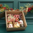This box is the ideal gift for those who wish to convey appreciation and exclusivity this holiday season. This elegant set includes a carefully chosen selection of gourmet products that evoke the flavor and magic of Christmas. Inside, you’ll find a delicious combination of traditional sweets, such as Christmas cookies and candies presented in a special glass jar, a Black Cat wine bottle, and a romantic flower bag. Presented in a box decorated with a Christmas bow and an elegant “Merry Christmas” design, you can personalize the jars or the box with your company logo. Box size: 20x19x7.5 cm