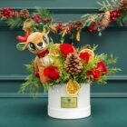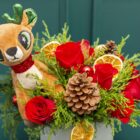 This adorable arrangement is the perfect touch to fill any space with joy and warmth this holiday season. Combining the elegance of red roses, the fresh scent of foliage, and the festive touch of orange slices and ornamental pine cones, with a tender reindeer that adds a touch of holiday charm and nostalgia, this arrangement is ideal for gifting or decorating your home with a festive spirit. It’s perfect for surprising guests and includes a personalized card.