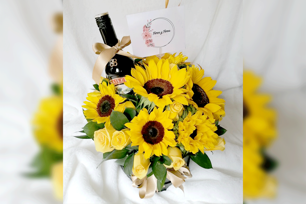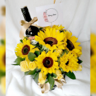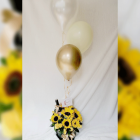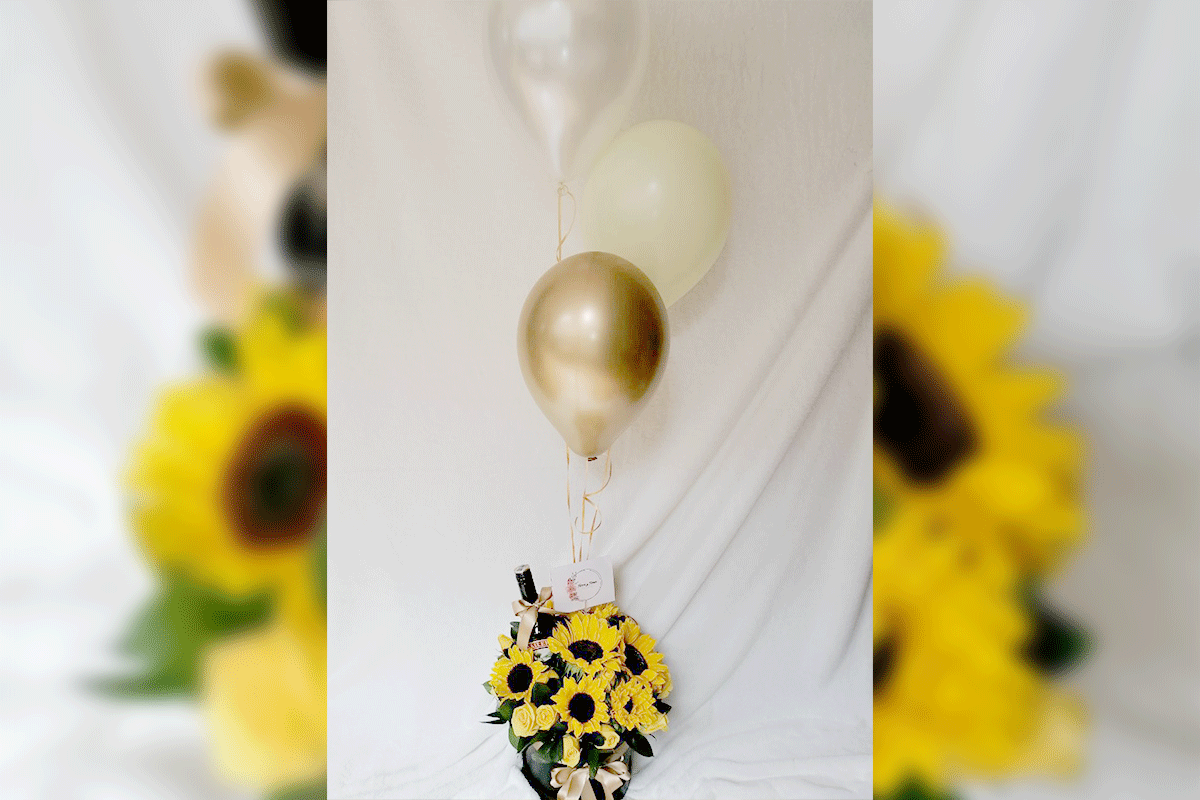Luxury round box with sunflowers, yellow roses, bay leaves, 3 helium balloons and a card with a message that you can personalize.