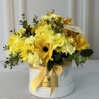 Beautiful box with a mix of seasonal yellow flowers and foliage, a beautiful presentation perfect for surprising, includes a card with a personalized message.