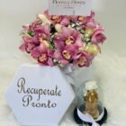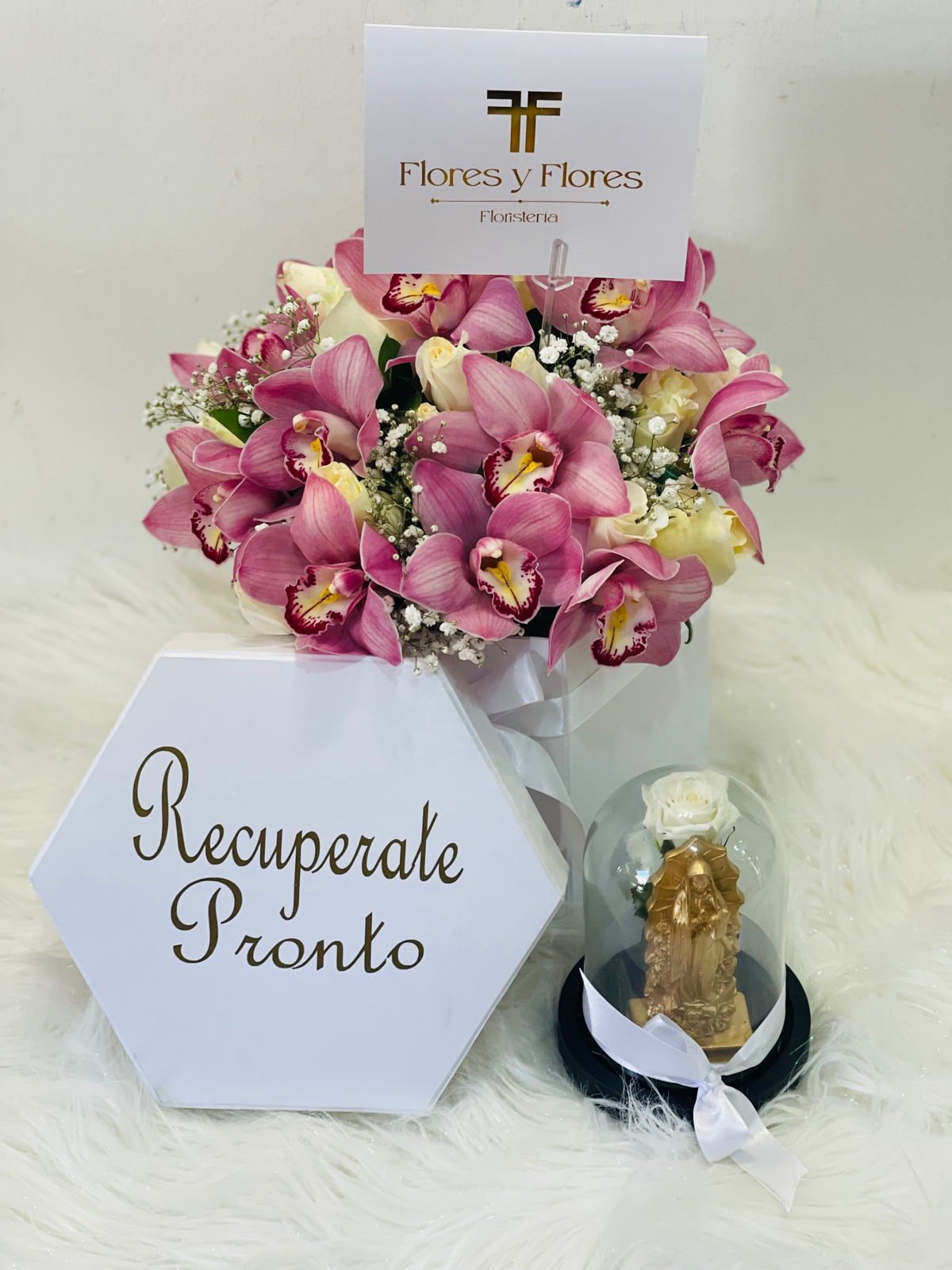 Hexagonal box with roses and orchids with a personalized message, plus a preserved rose in an urn, with a small Virgin of Guadalupe.