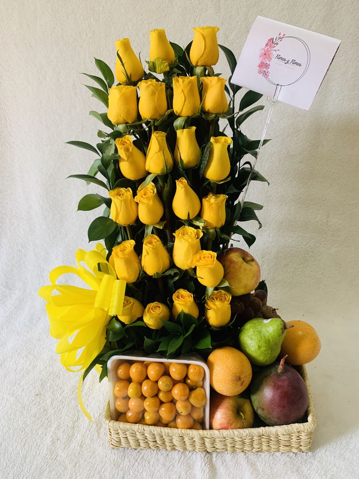 Beautiful fruit bowl with 24 yellow roses in a wicker basket and seasonal fruits.