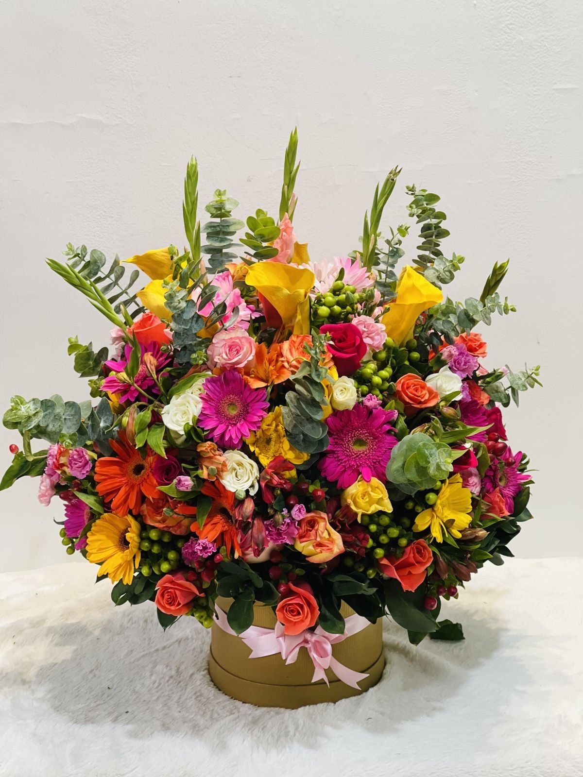 Beautiful design with exotic flowers, roses, lilies, gerberas, gladioli, in a luxury gold box.