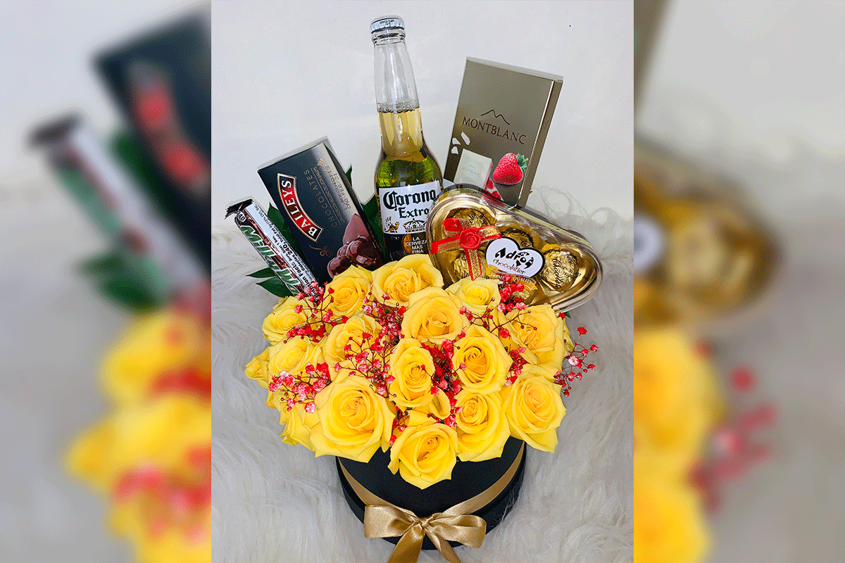 Arrangement in a round box with 24 yellow roses, chocolates, beer, and a card with a message that you can personalize.