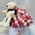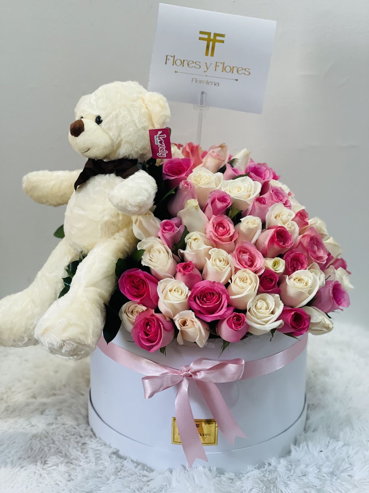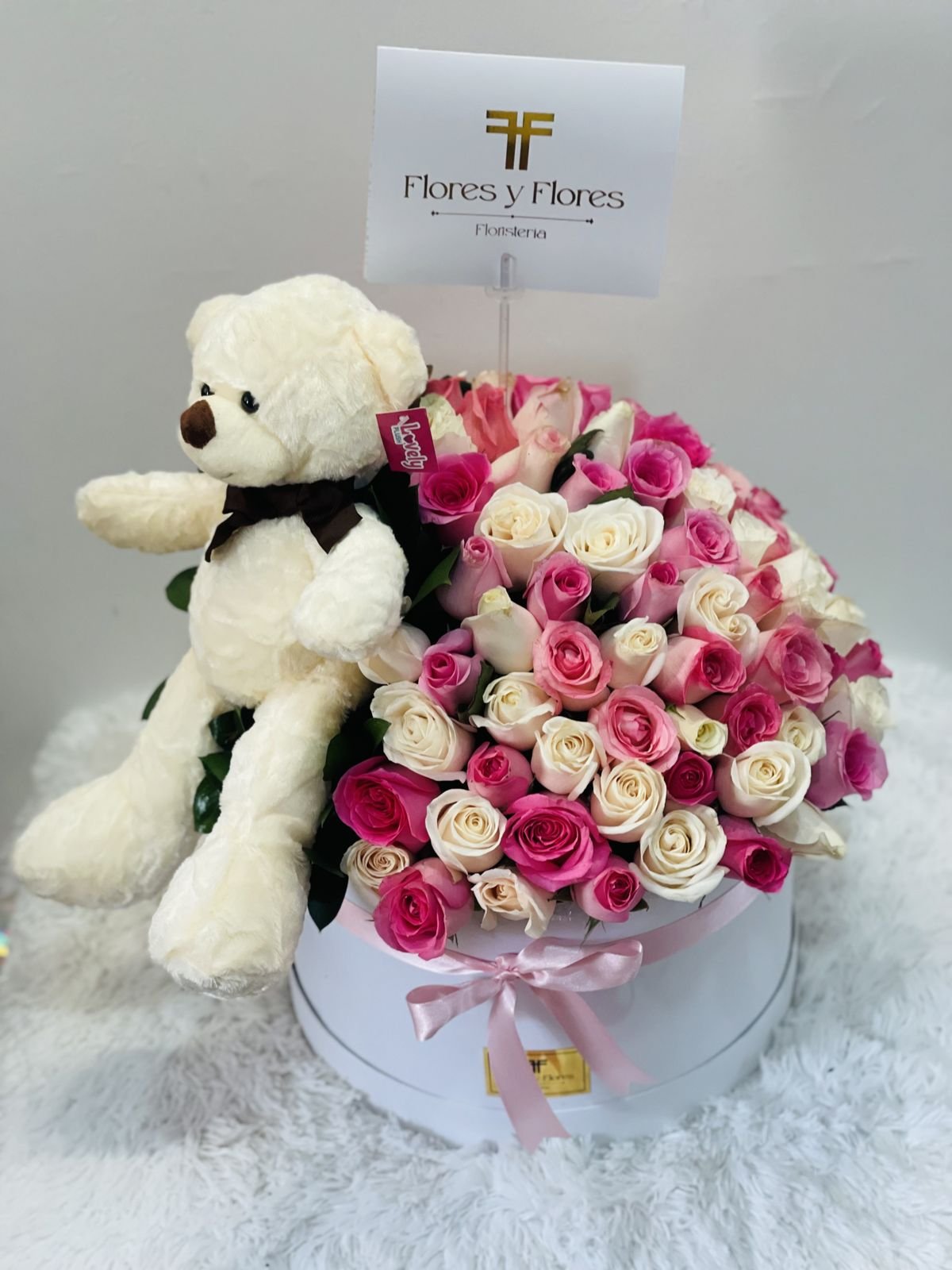 Box of 100 pink and white roses, with a teddy bear (bear design subject to availability) with a bouquet of balloons and a card that you can personalize.