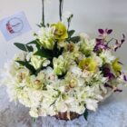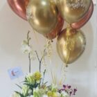 Beautiful luxury basket with a floral arrangement of hydrangeas, roses, orchids, and a two-stem orchid plant, perfect for surprising guests. Includes a balloon bouquet that you can customize as you wish.