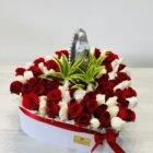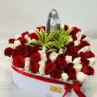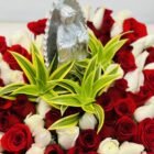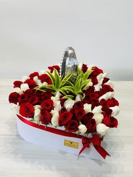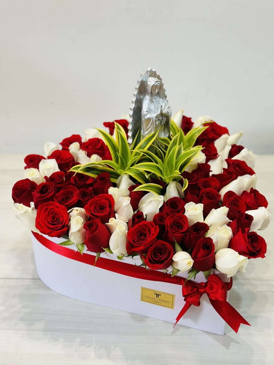 A beautiful white box with a large heart, containing more than 70 white and pink roses, featuring the Virgin of Guadalupe and seasonal foliage. A thoughtful gift to surprise that special someone. Includes a personalized message.