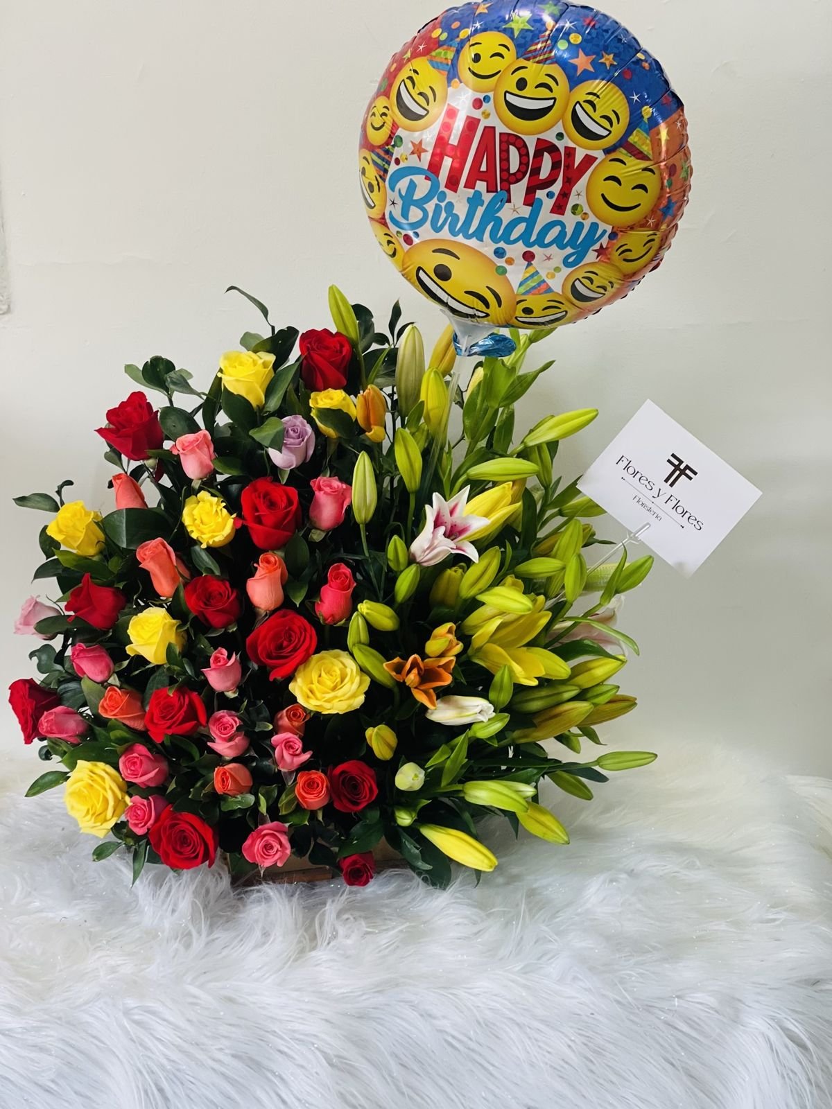 Beautiful exotic arrangement of 80 assorted roses, 10 lily stems in assorted colors, and an 18-inch balloon. You can customize the balloon design.