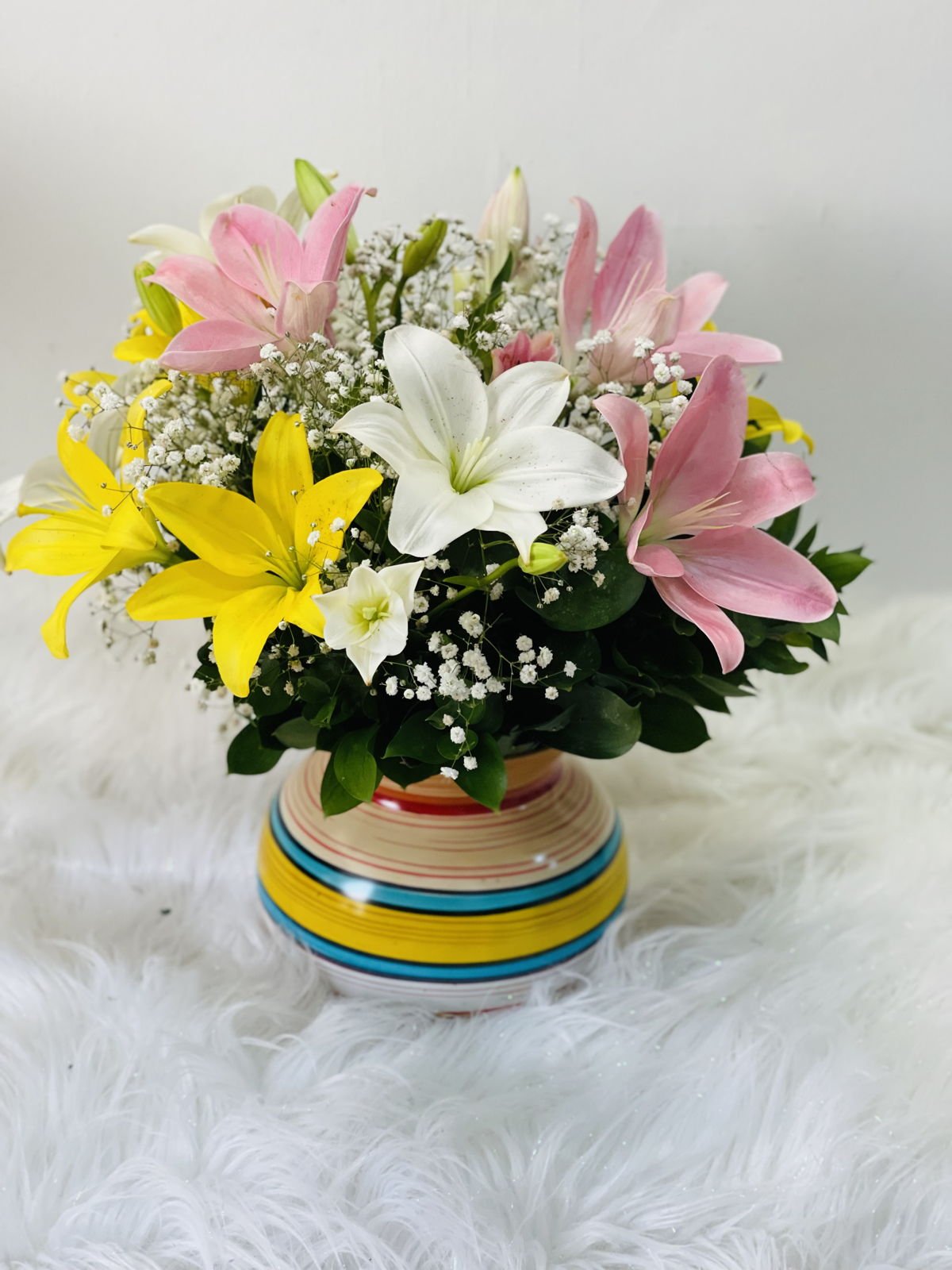Beautiful deluxe rainbow Bahamas with assorted lilies and seasonal foliage; includes a personalized message.
