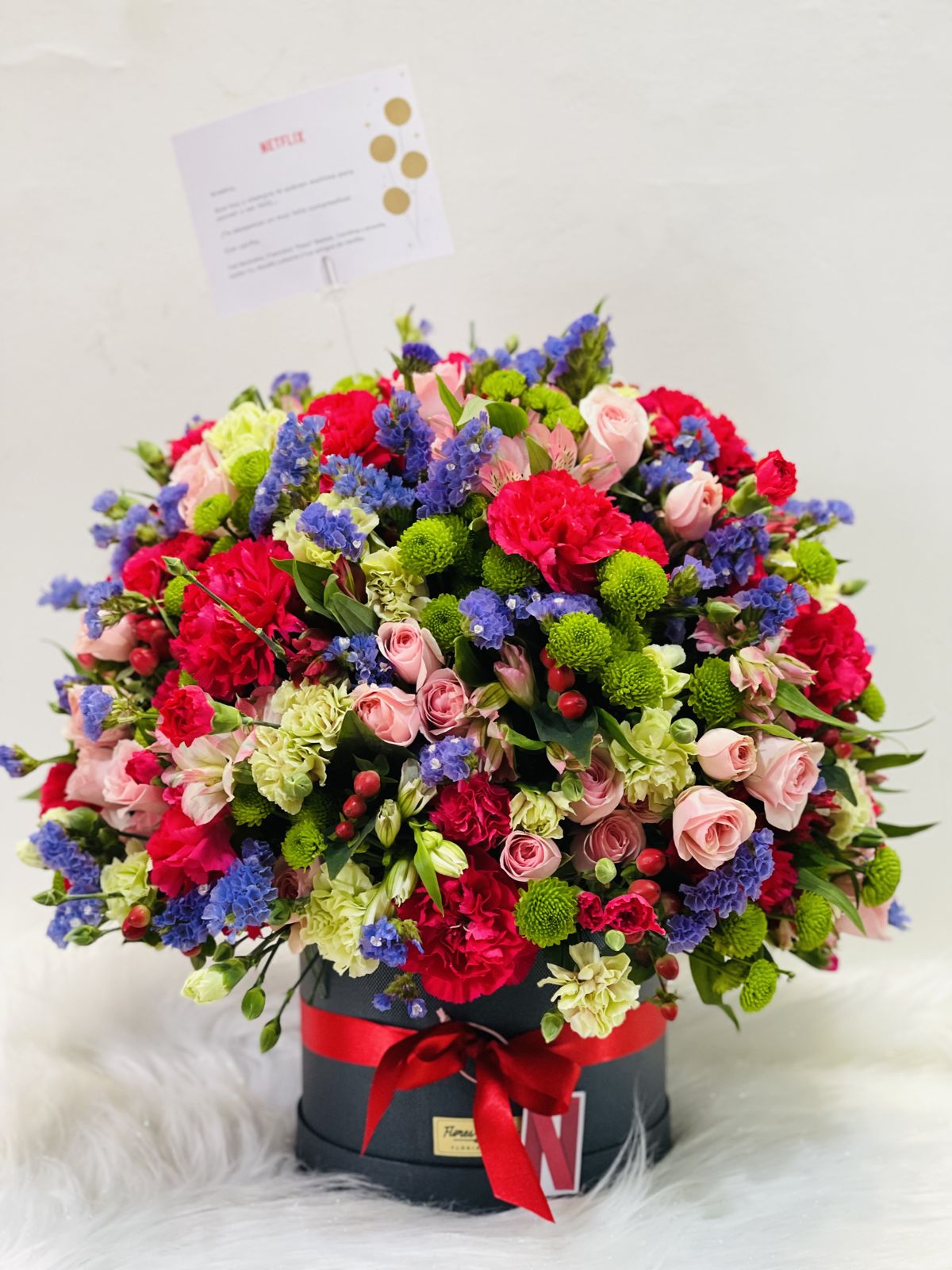 A beautiful round box with assorted flowers and foliage and a card with a personalized message make the perfect combination to surprise that special someone.