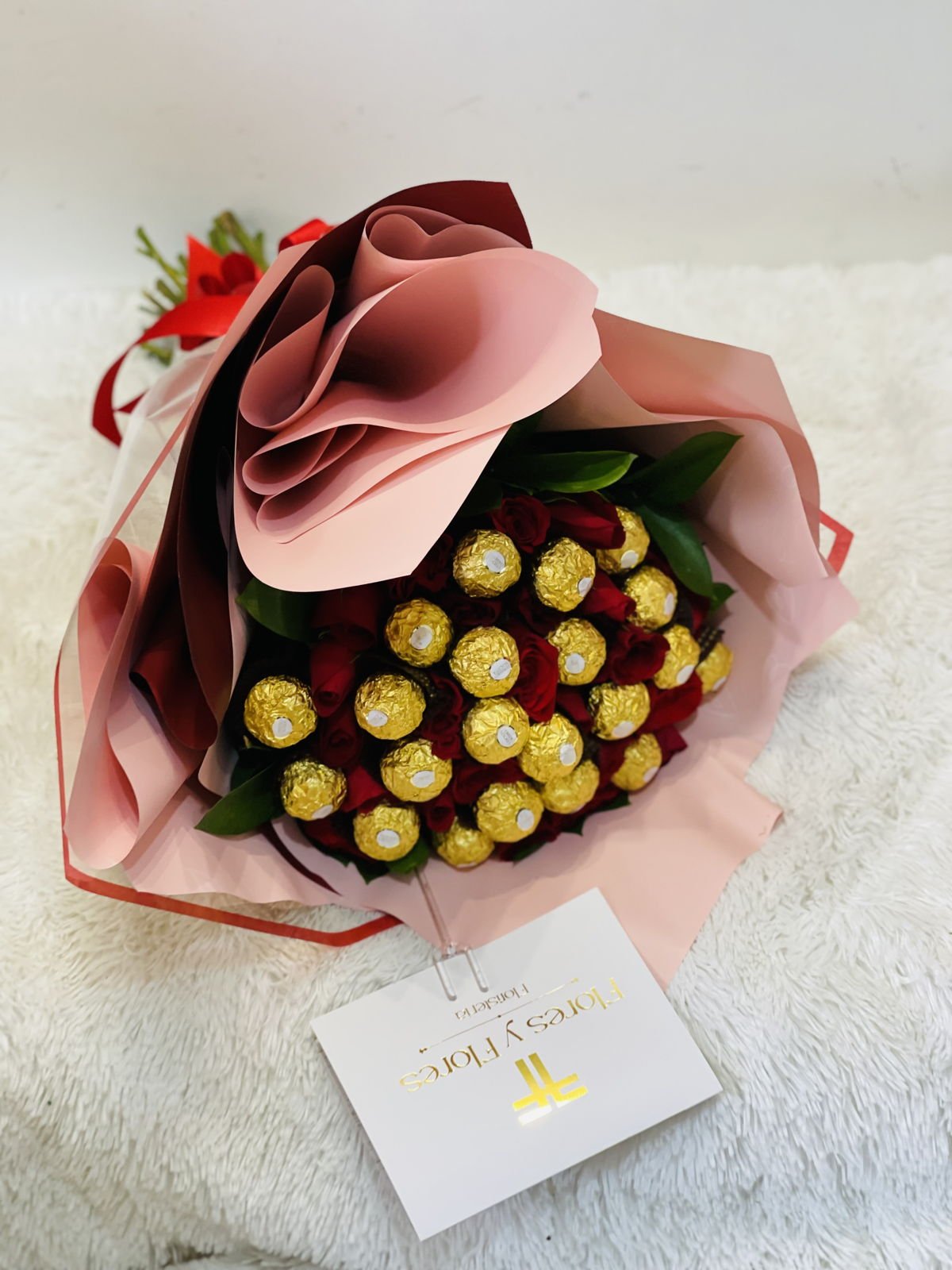 Beautiful bouquet of 24 roses and 24 Ferrero chocolates, wrapped in imported, pink and gold papers, with a special bow