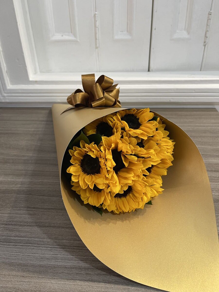 Beautiful bouquet of 8 sunflowers in special luxury gold packaging, including a card that you can personalize with any message you want.