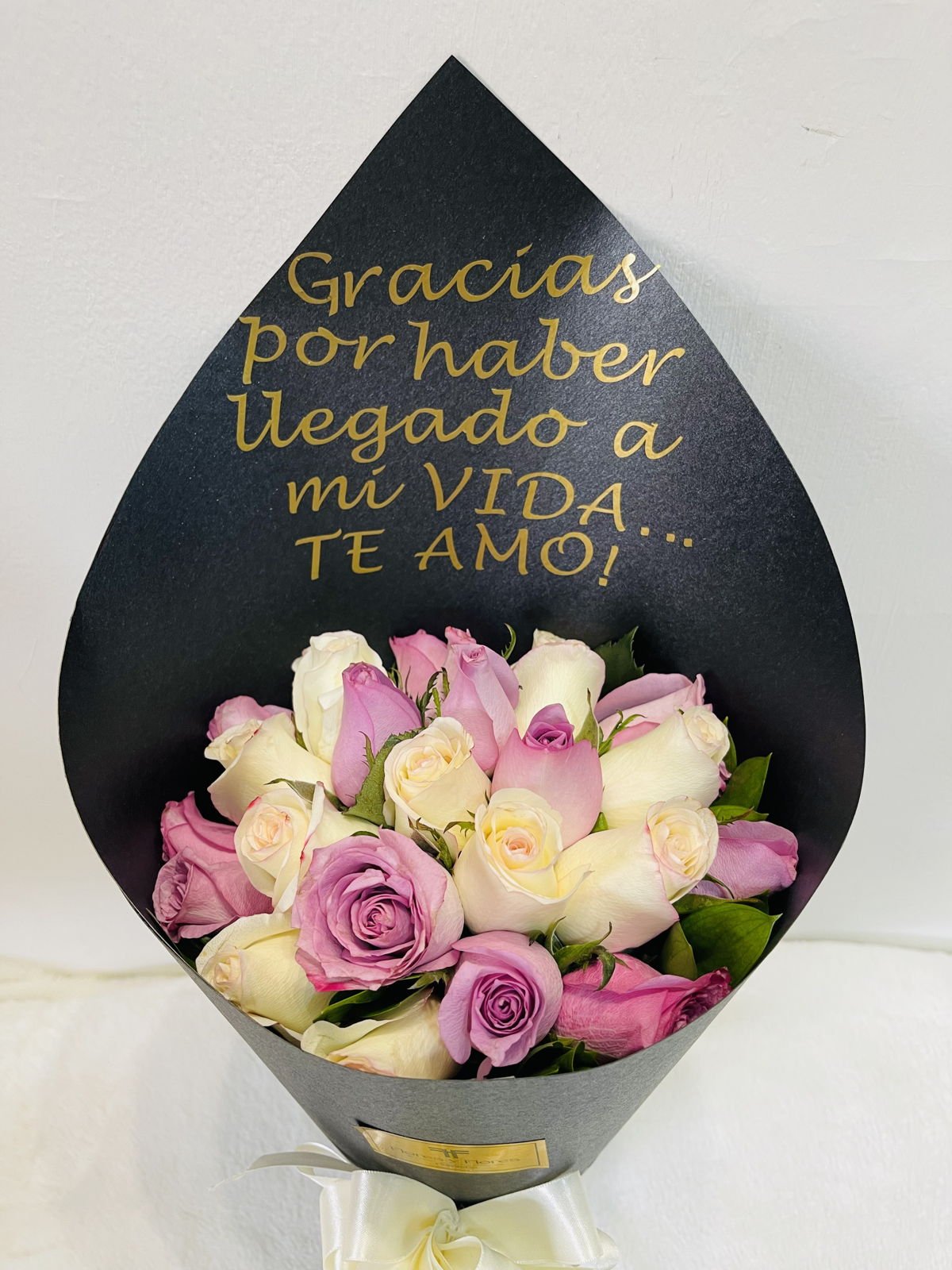 A beautiful bouquet of 24 white and lilac roses in special, luxurious black packaging. You can personalize the packaging with a short message.