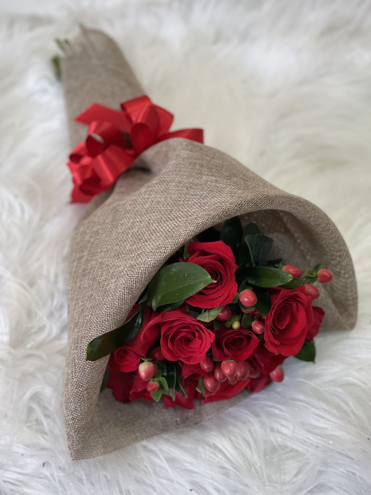 Beautiful bouquet of 12 red roses and seasonal foliage, wrapped in jute fabric and a red fabric ribbon bow.