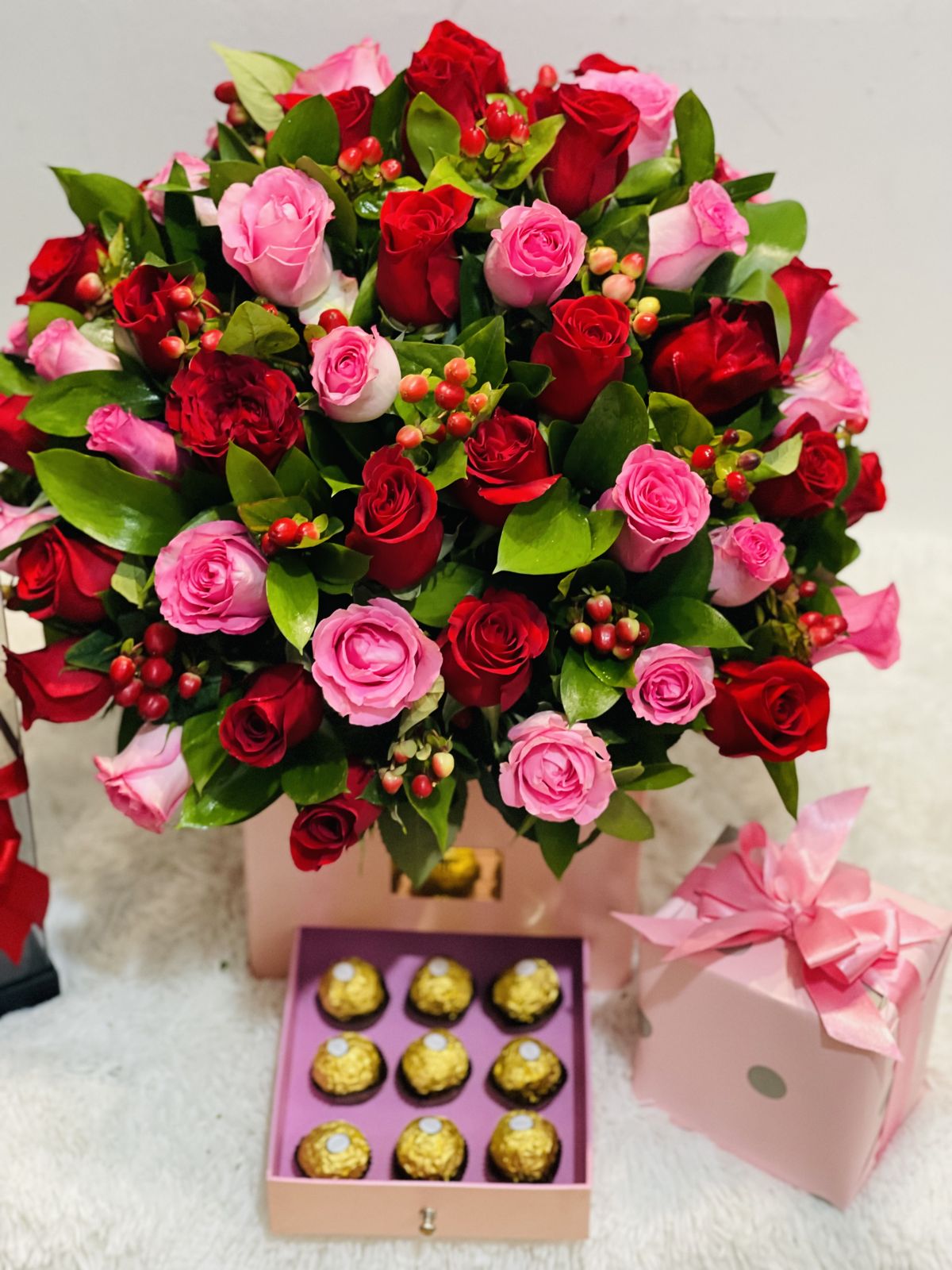 Beautiful chest box with 50 pink and red roses, with seasonal foliage and 8 Ferrero chocolates.