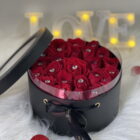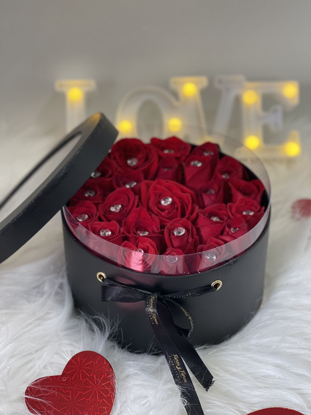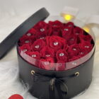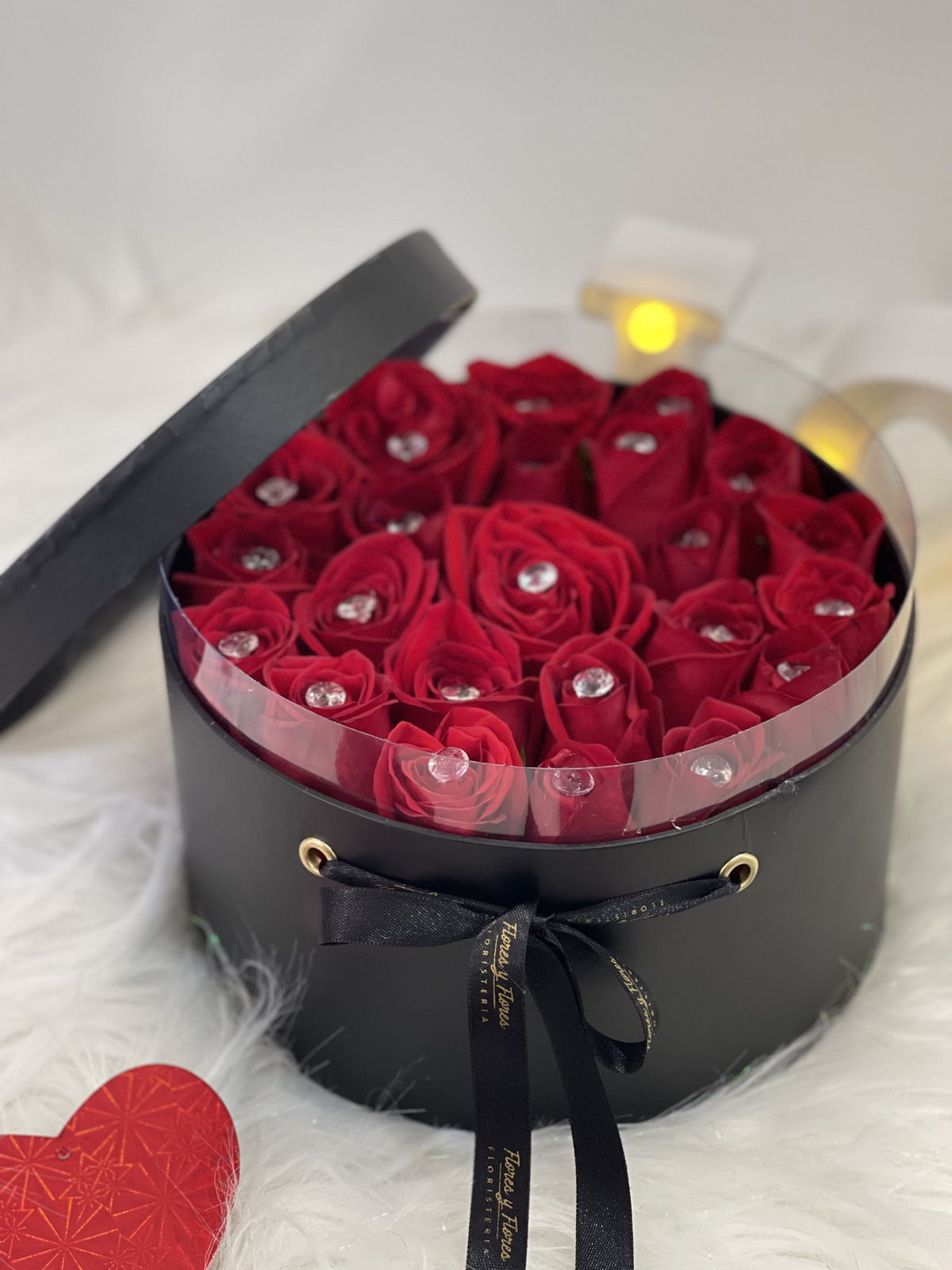 Round box with acetate details, red roses, sparkling gems, and a card with a personalized message.