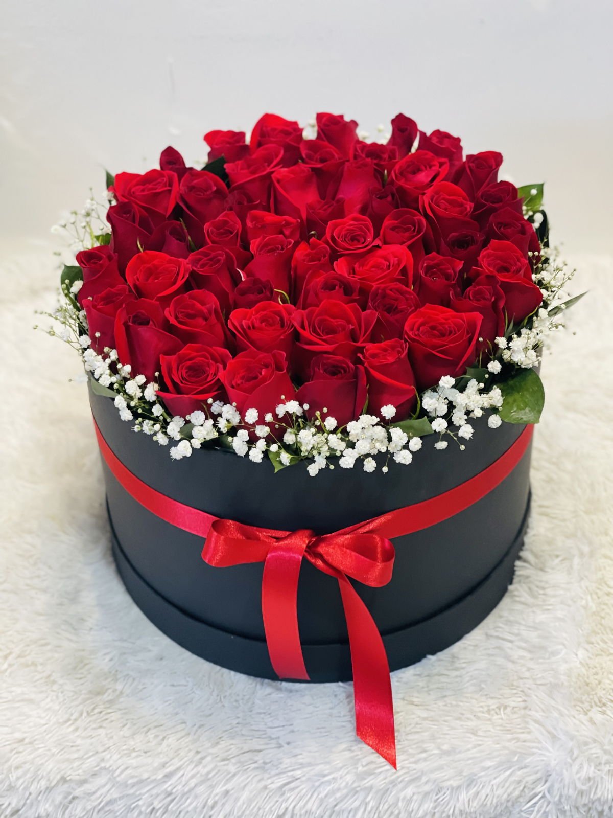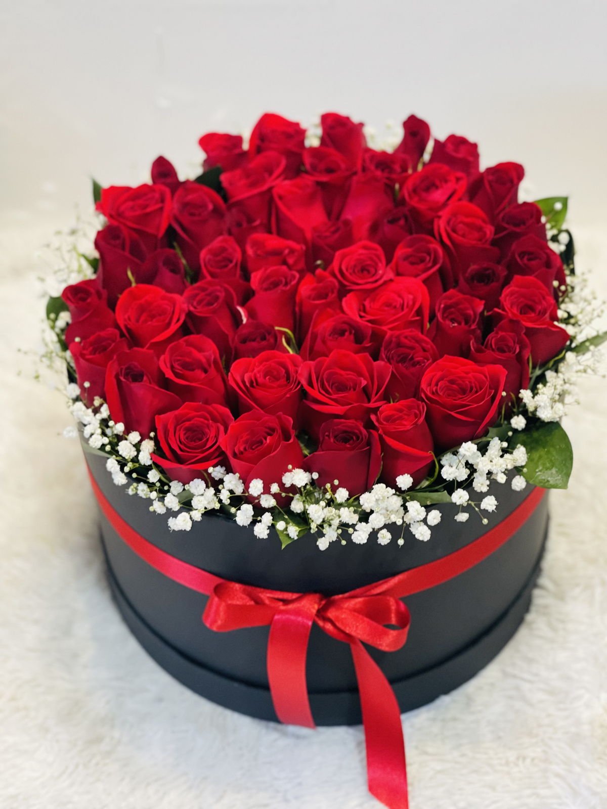 Beautiful round box with 50 red roses, a shimmering border and seasonal foliage, and a card with a personalized message.