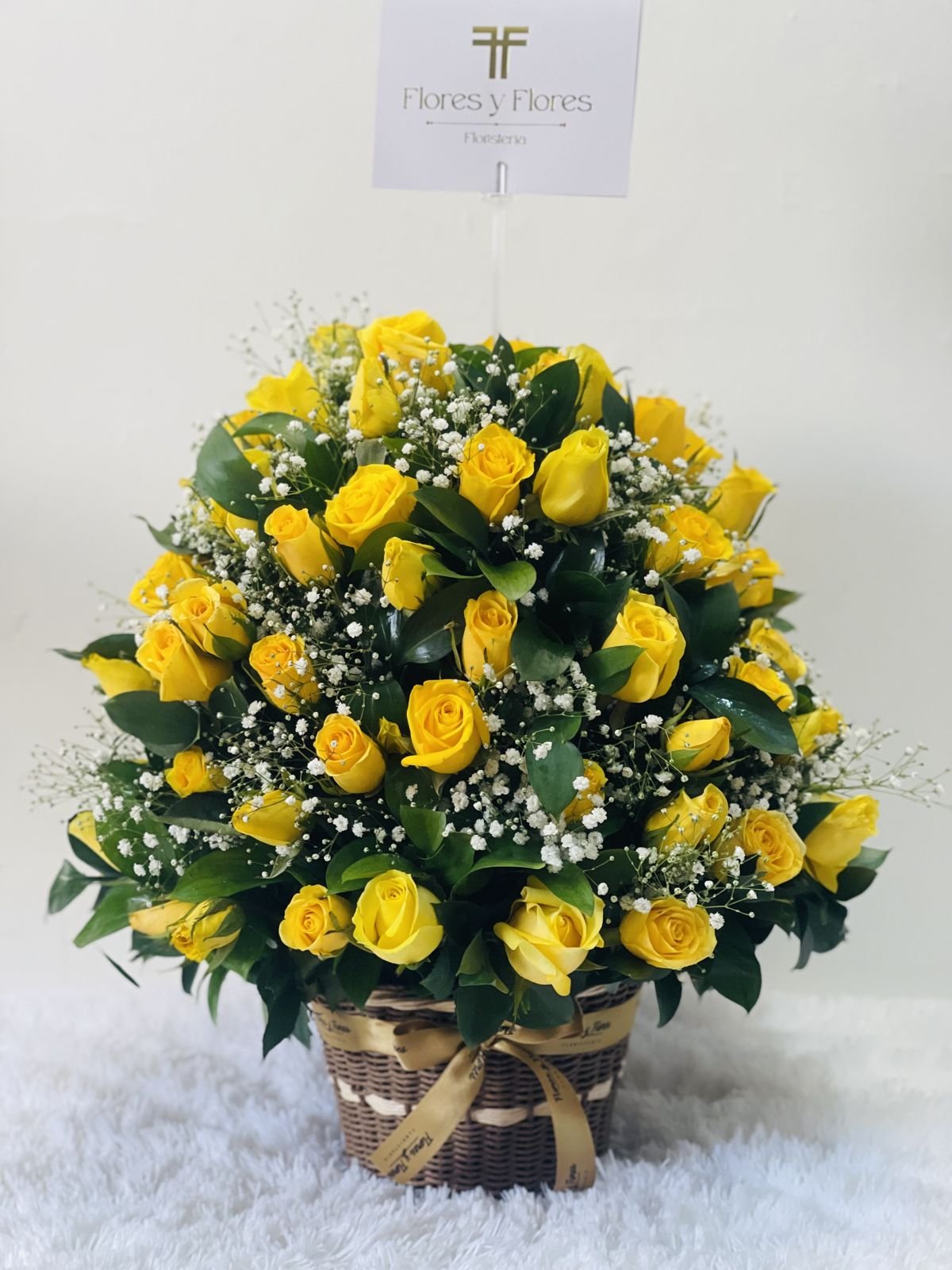 Beautiful wicker basket of 100 yellow roses, with seasonal foliage, with special decoration.