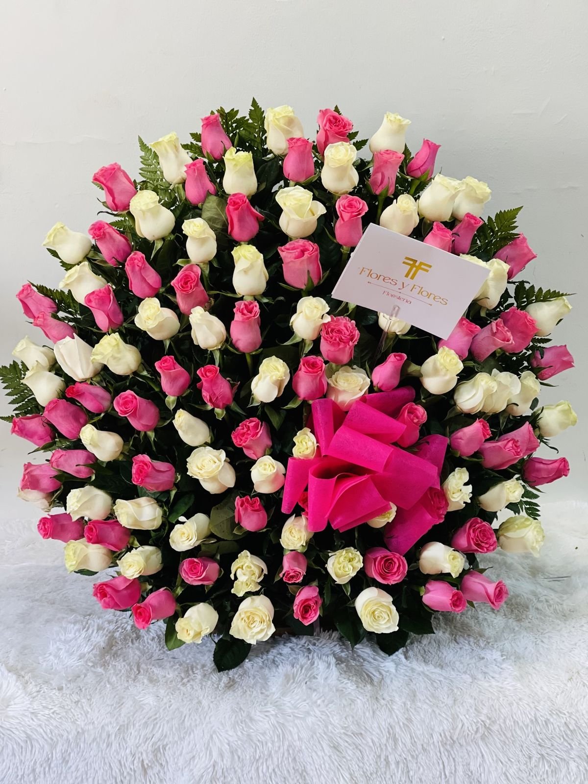 Beautiful basket of 120 fuchsia and white roses with a special bow, made in a beautiful wicker basket.
