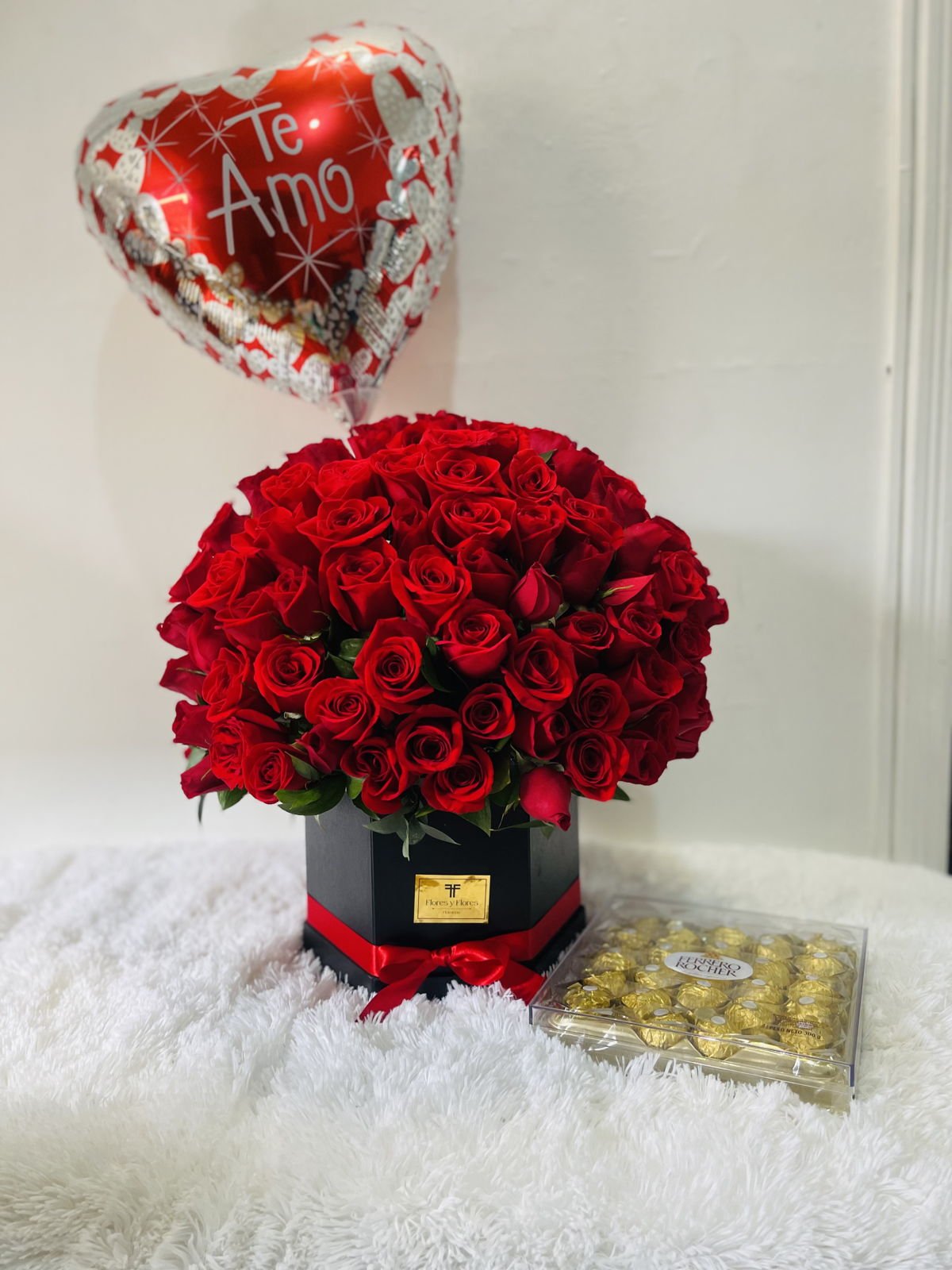 A beautiful arrangement of 100 red roses in a black hexagonal box, with seasonal foliage, a personalized 18-inch balloon, and a diamond-cut box of 12 Ferrero chocolates.