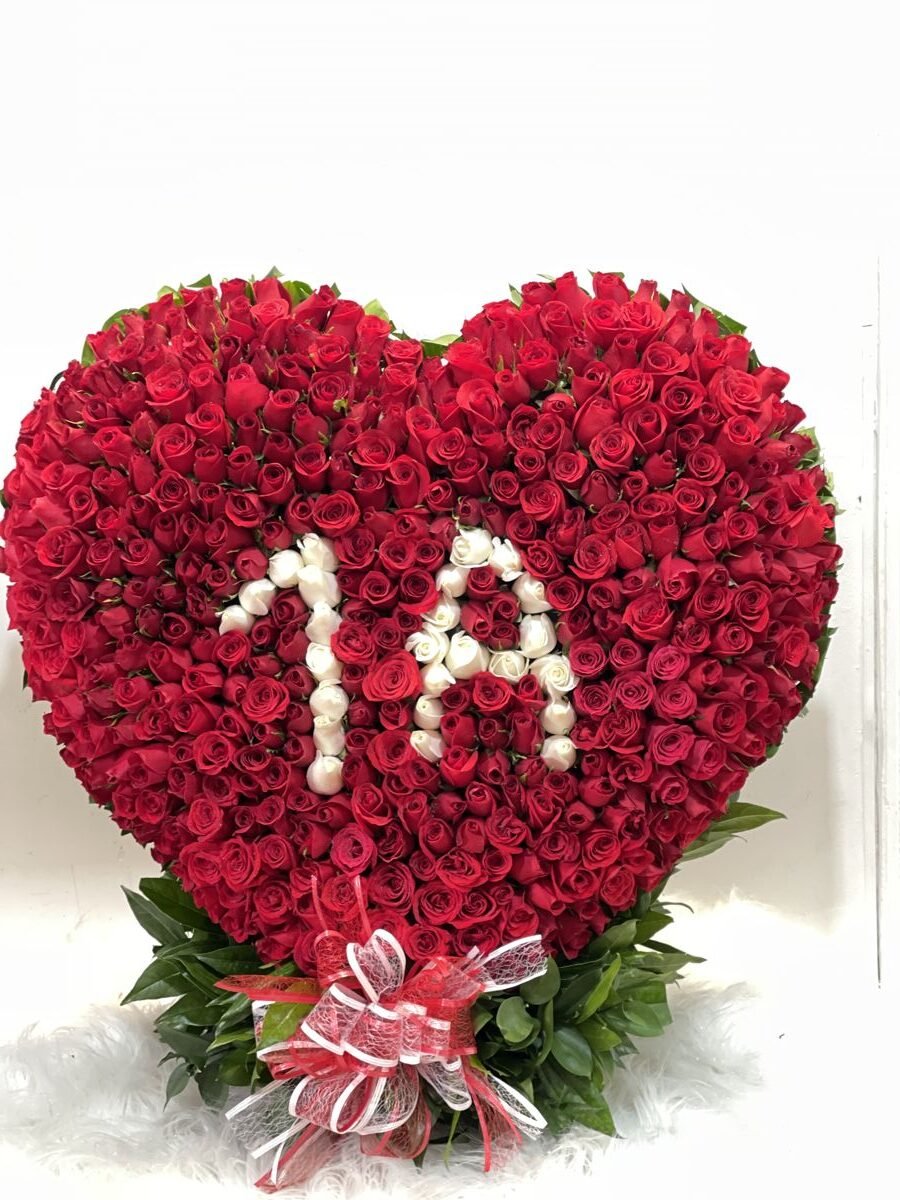 Beautiful heart, with more than 400 red roses and central letters in white rose. You can change the letters or numbers according to your preference.