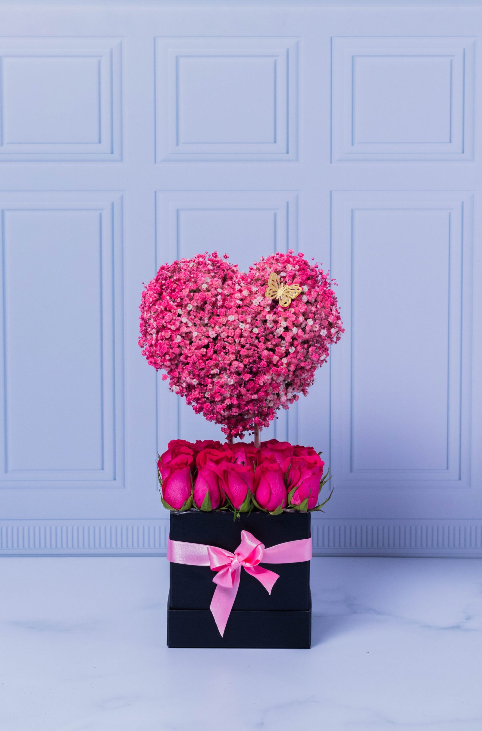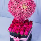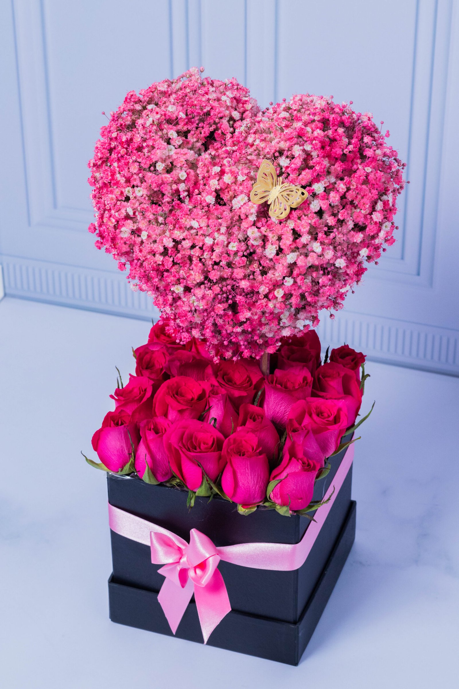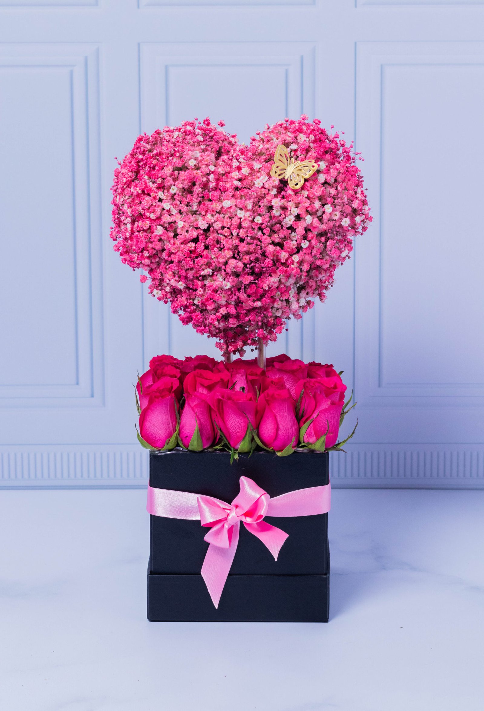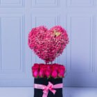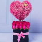 Carved heart covered with pink hibiscus, decorated with a golden butterfly, on a bed of fuchsia roses in a luxury box. A beautiful design to surprise. Includes a card with a message that you can personalize.