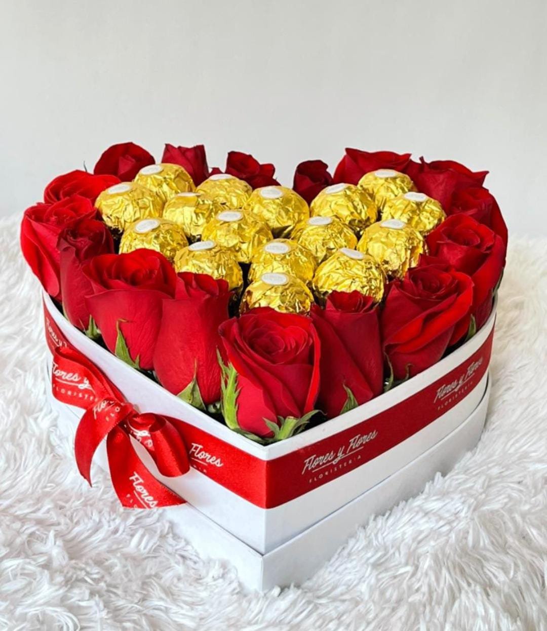 Beautiful half-heart, with 16 Ferrero chocolates and 16 red roses, in a white heart box, with a beautiful decorative bow.