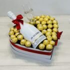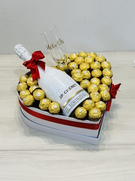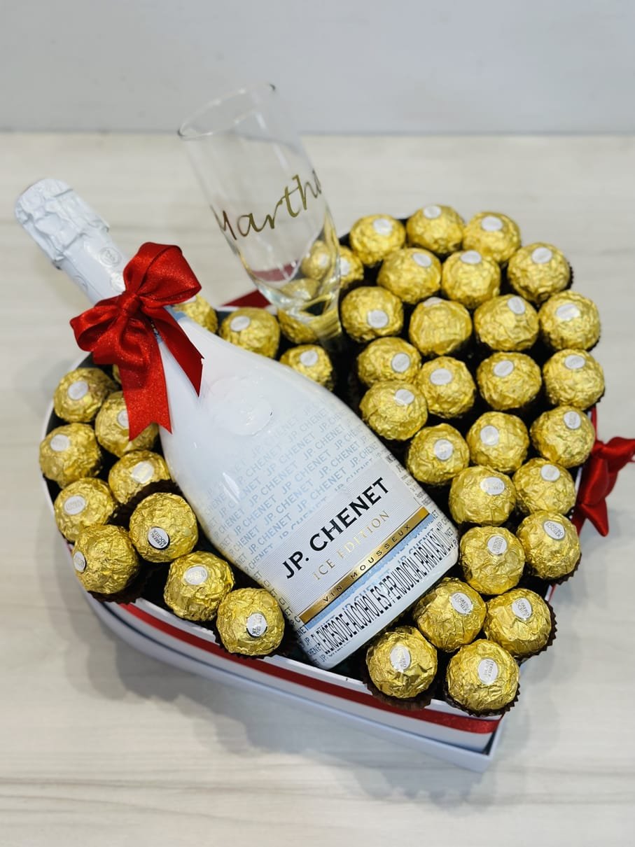 A beautiful heart-shaped box with more than 25 Ferrero chocolates, JP Chenet champagne, and a glass with a personalized name. The arrangement includes a message of your choice.
