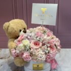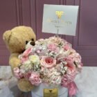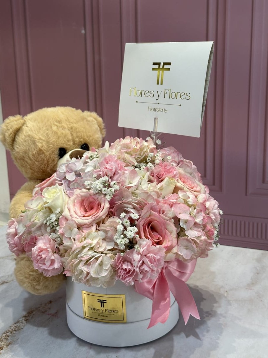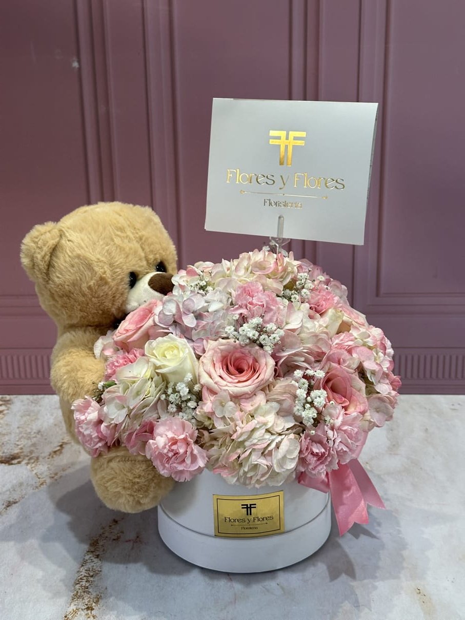 Beautiful box with hydrangeas, roses, and assorted flowers in shades of pink and white, including a luxury teddy bear and a card with a personalized message.